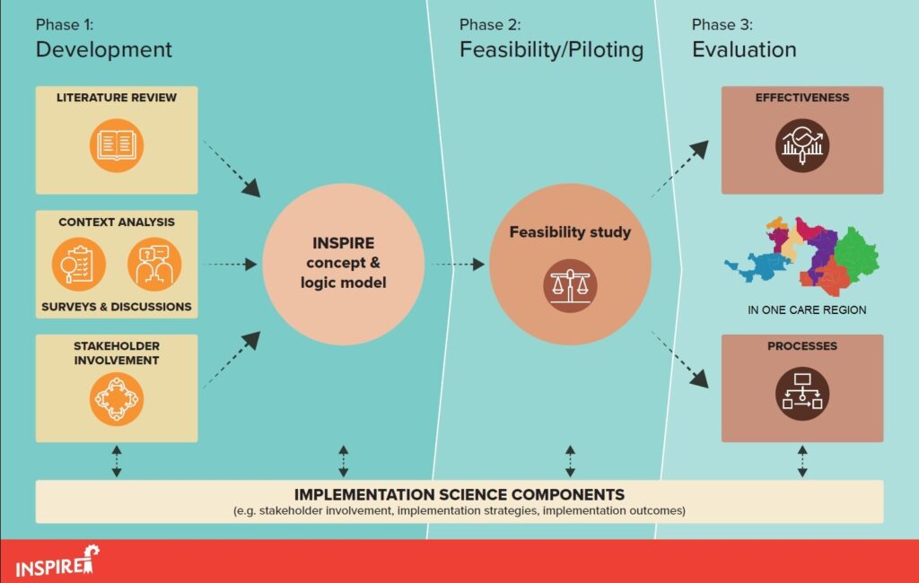 The INSPIRE-ACT project builds on the legal and care framework of Basel-Landschaft and the lessons learned from the original INSPIRE project. It is organized in three phases, following the Medical Research Council (MRC) Framework for the development, adaptation, and evaluation of complex interventions.